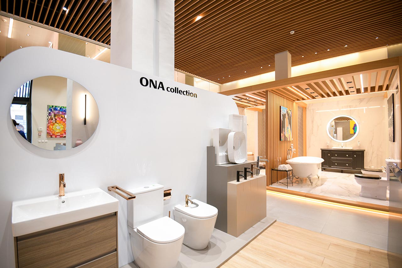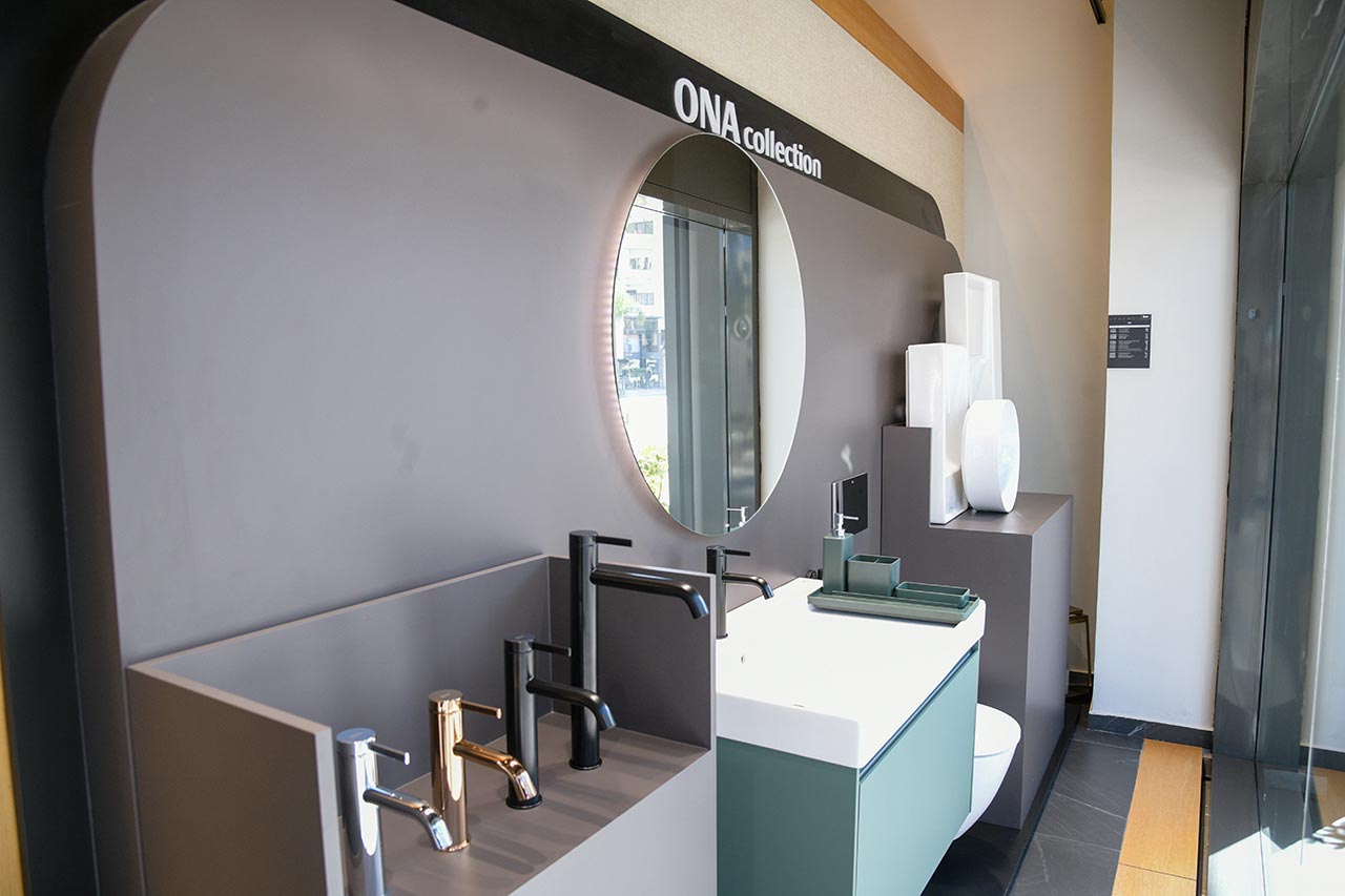 L’un des éléments les plus singuliers de la collection Ona est sa robinetterie au design distinctif. Conçue par Benedito Design, elle représente l’équilibre parfait entre design, technologie et durabilité. Elle se distingue par un corps de forme cylindrique et particulièrement élancé, disponible en différentes hauteurs et longueurs de bec, en plus de la présence de poignées de robinets à la fois plates et minimalistes. À l’intérieur, le système d’ouverture à froid, le limiteur de débit et une cartouche céramique de diamètre réduit garantissent une plus grande efficacité et praticité d’utilisation, tout en garantissant une consommation d’eau réduite. Les robinetteries Ona sont proposées en quatre finitions : l’option chromé avec revêtement électrolytique Evershine, deux nouvelles couleurs avec finition exclusive Everlux PVD (noir titane et rose gold) et classique noir mat. La gamme comprend également des versions pour douches et baignoires (montage mural et encastré), mais aussi pour cuisines et salles de bains publiques, avec fonctionnement sans contact.