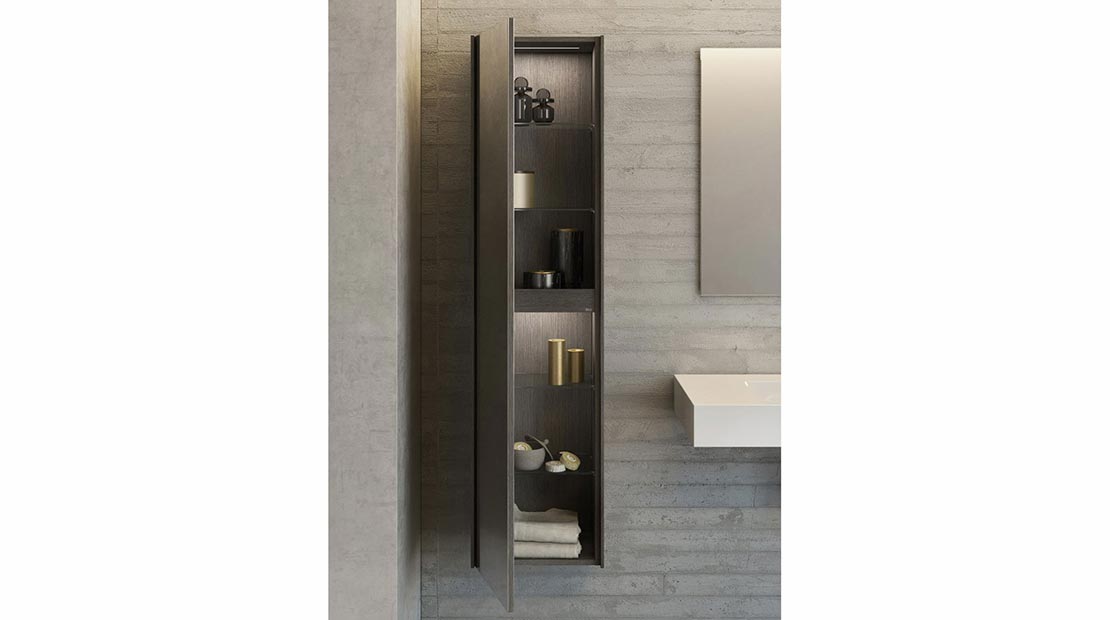 L’ensemble de la collection a été conçu dans le but de garantir le maximum de confort et de qualité, les tiroirs, par exemple, sont pourvus d’un système d’extraction complet et d’un intérieur divisé en compartiments avec finition texturée en bois foncé qui reste très agréable au toucher. Le système de fermeture est à la fois doux et silencieux. Les colonnes sont, quant à elles, rétro-éclairées. On retrouve également des étagères en verre fumé et des miroirs plein corps.