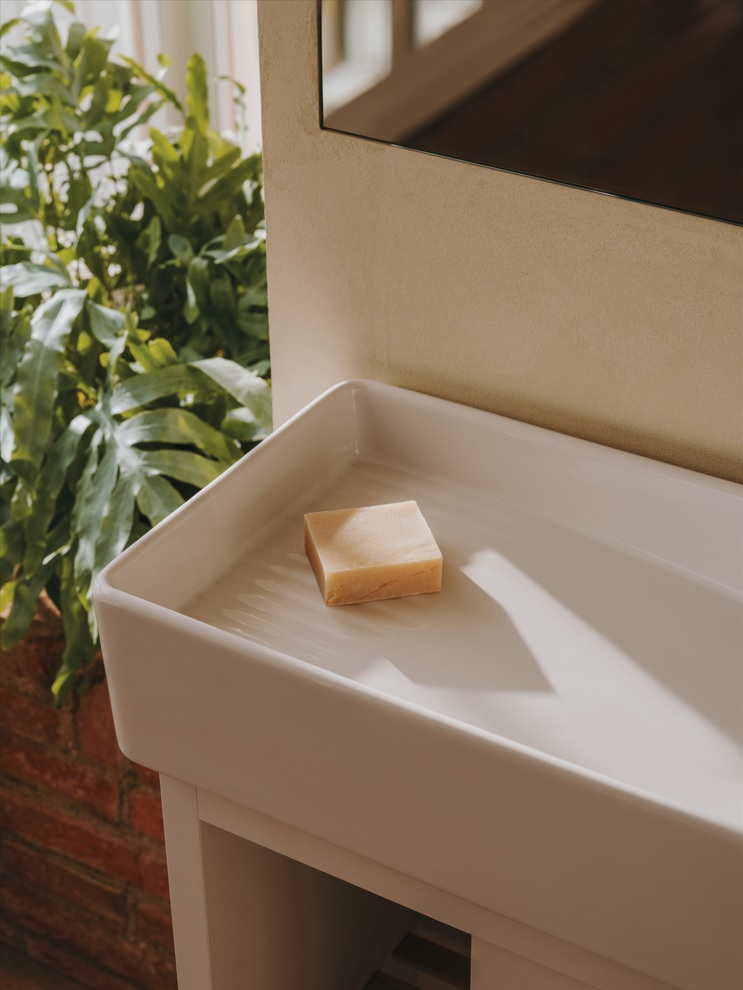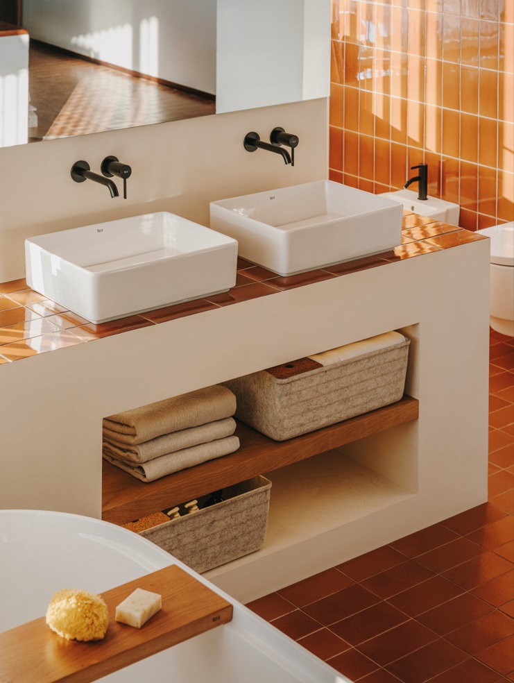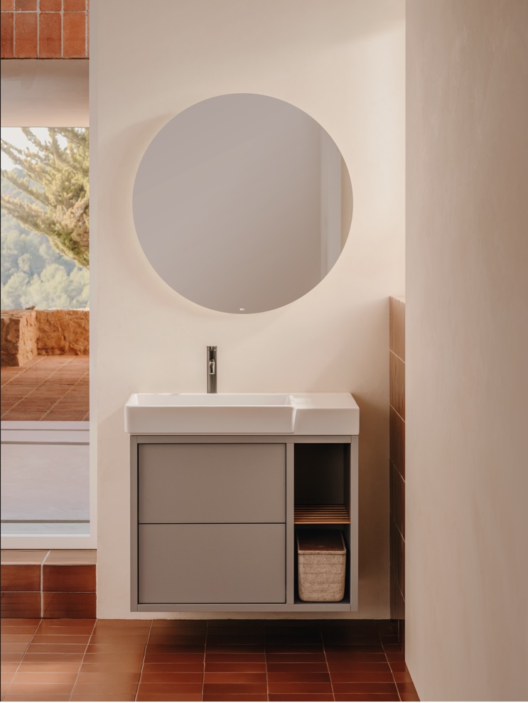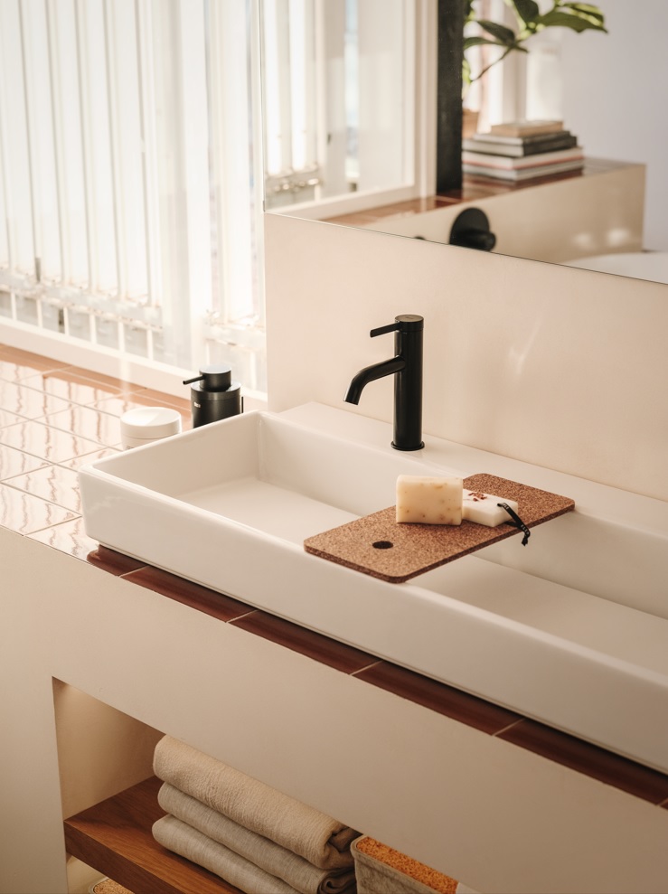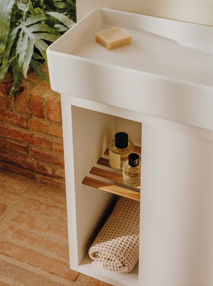 Les meubles Tura sont un exemple de synthèse architecturale, car ils s’intègrent parfaitement aux lavabos. Conçue à partir de lignes droites, d’espaces vides et de formes très simples, la collection se décline dans quatre finitions mates : blanc cassé, gris clair, terracotta clair et orme clair qui, comme les deux autres, est tout aussi subtile et naturelle.